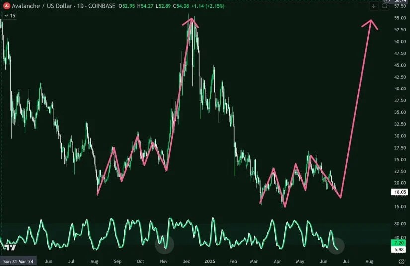 The chart shows a range-bound region with compressed volatility. RSI is beginning to tick upward, and the price is approaching a squeeze point. If this fractal does repeat, a breakout above $22 could open the door to $35 and beyond, retracing the same path AVAX carved out late last year.