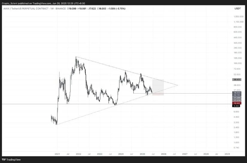 A symmetrical triangle on AVAX’s weekly chart signals potential for a strong breakout if support near $17.3 holds. Source: Crypto_Scient via X