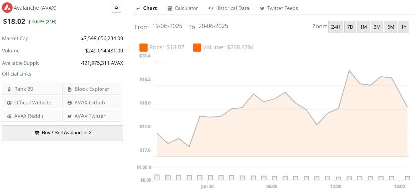 Avalanche’s current price is $18.02, up 0.69% in the last 24 hours. Source: Brave New Coin