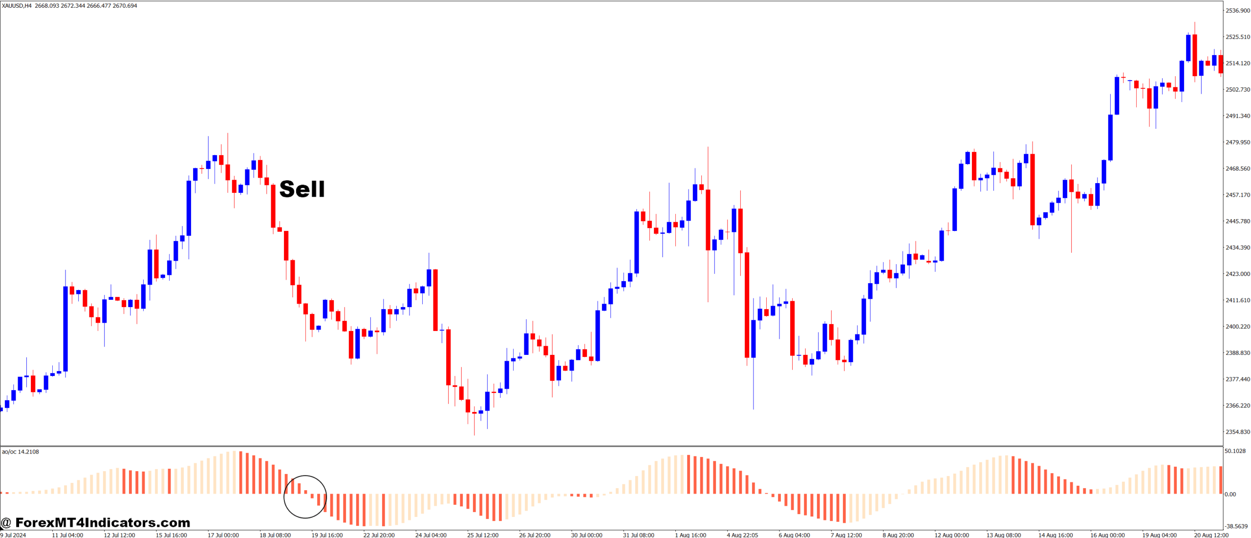 - Signal Confirmation: Look for a red or bearish signal on the Awesome OC MT4 Indicator, which indicates downward momentum.