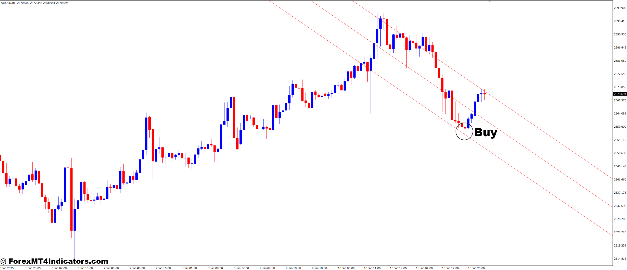 - Consider entering a buy trade when price starts moving upward after touching the lower channel.