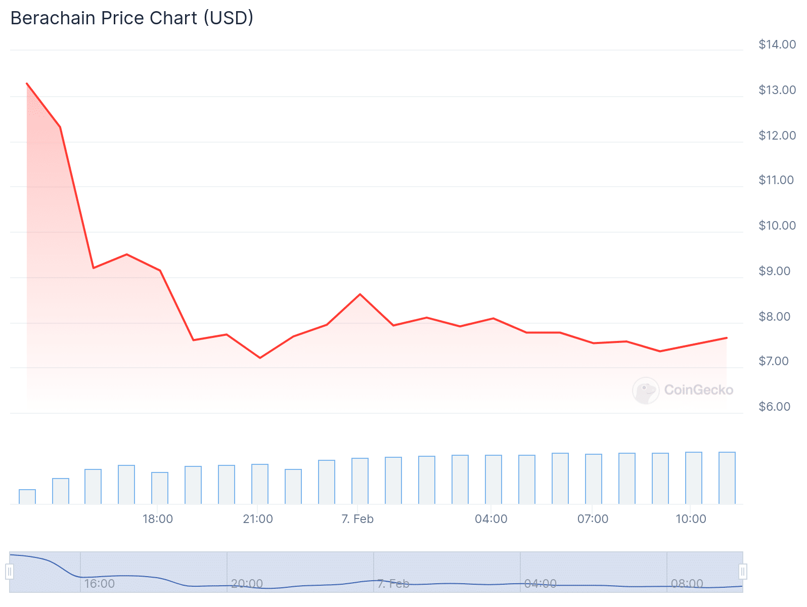 - Berachain crypto’s BERA token is experiencing price swings, falling from $14 to around $7-$8, ahead of its 79M token airdrop.