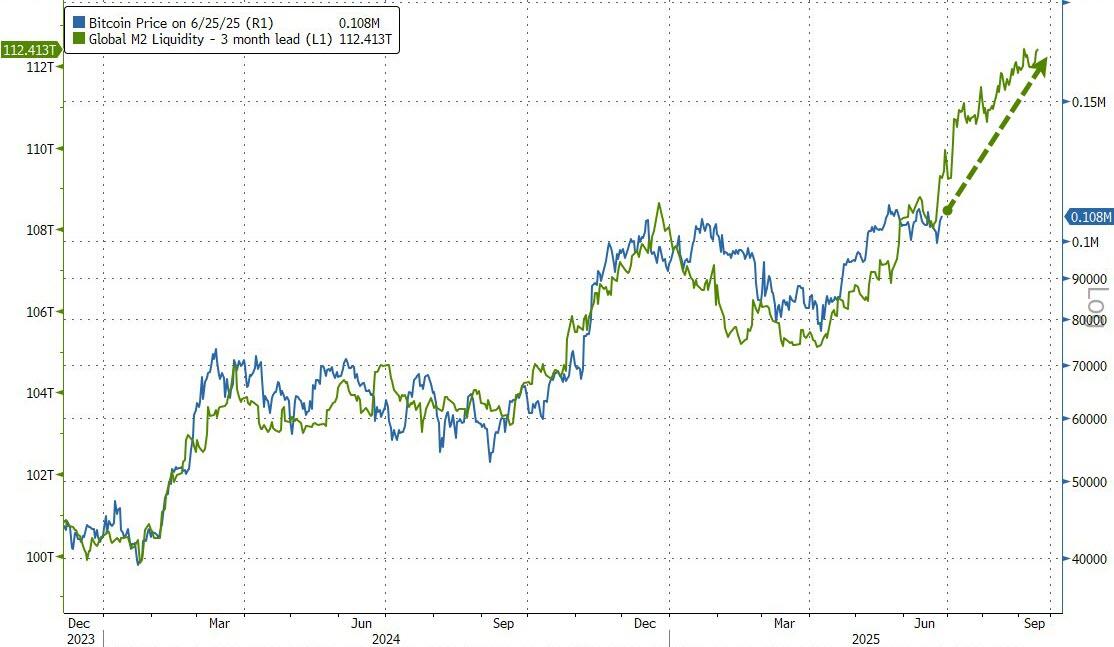 It comprises liquidity from M1, which is physical cash, savings deposits, money market funds, and other forms of cash readily available for economic activities. Typically, a growth in global liquidity usually translates to an increase in investment appetite, favoring assets like Bitcoin.
