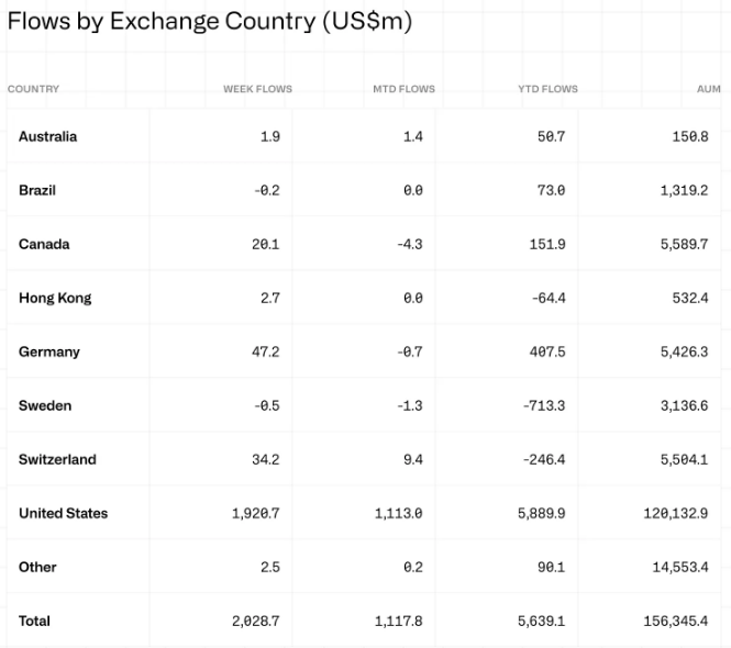 Germany, Switzerland, Canada, Hong Kong, and Australia also saw positive flows of $47.2 million, $34.2 million, $20.1 million, $2.7 million, and $1.9 million, respectively. However, Sweden and Brazil witnessed outflows of around $500,000 and $200,000, respectively.