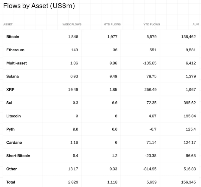 Other crypto assets, such as XRP, Short Bitcoin, Solana, and Cardano, saw inflows of $10.49 million, $6.4 million, $6.03 million, and $1.16 million, respectively. Multi-asset and Sui saw investments of $1.86 million and $300,000, respectively.