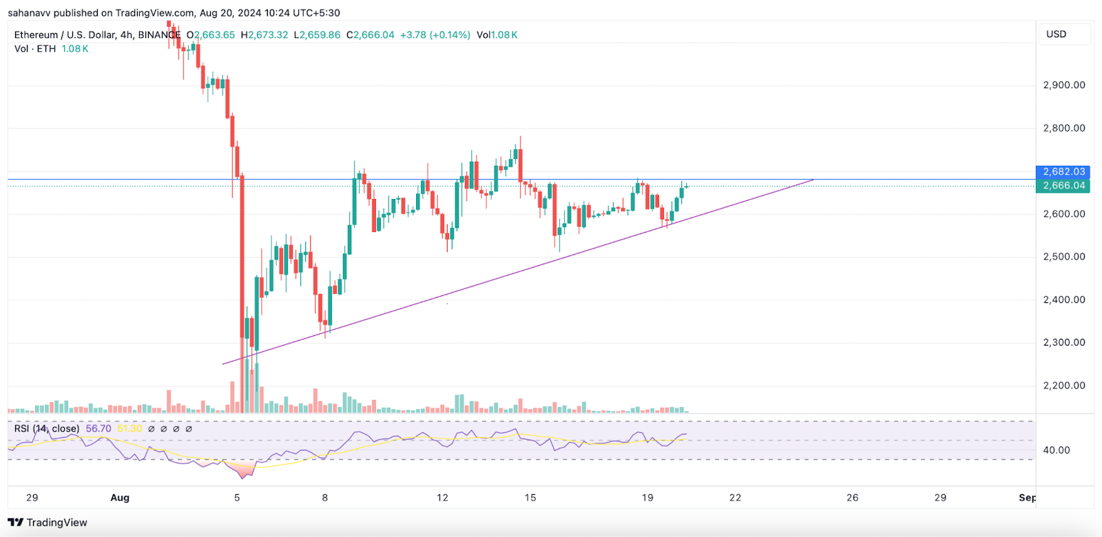 The ETH price maintains a strong ascending trend; however, the bears have managed to have great control above the levels at $60,000. As a result, the bulls fell weak soon after rising above these levels, due to which the token faced rejection from the lower ascending support. The RSI has displayed a rise, but the mounting selling pressure may hinder the progress of the rally. Hence, the Ethereum price could remain consolidated below the resistance and reach the apex, followed by a breakout above $2800.