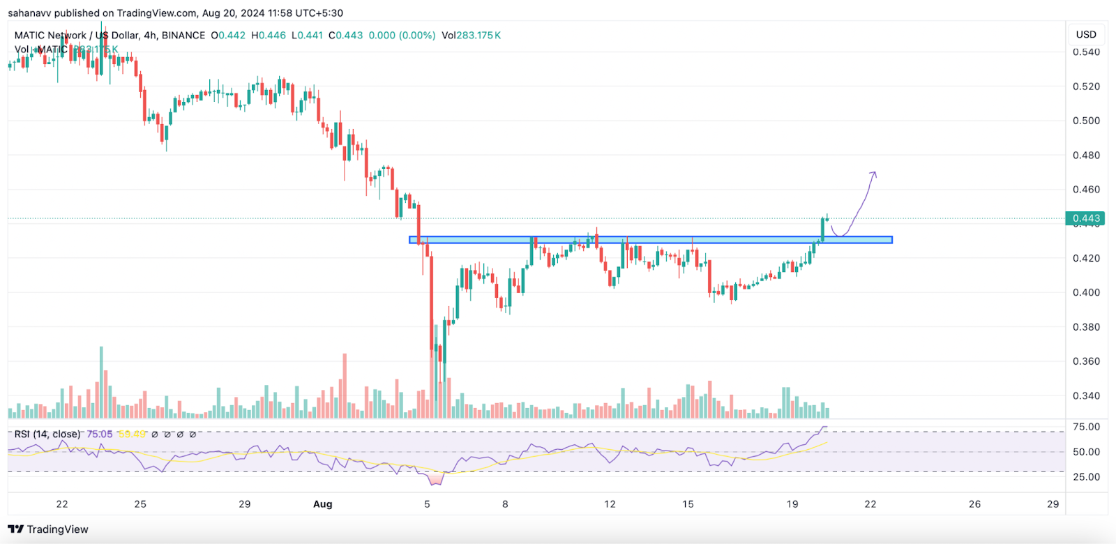 Polygon price has surpassed the crucial resistance zone, which may pave the way to testing the upper targets. In the event of a pullback, as the RSI has reached the upper bands, these resistance zones may offer a strong base to trigger a healthy rebound. Therefore, the MATIC price is believed to form constant higher highs and lows, displaying the growing strength among the bulls. Therefore, the Polygon price is believed to rise and reclaim $0.5 in the next few days.