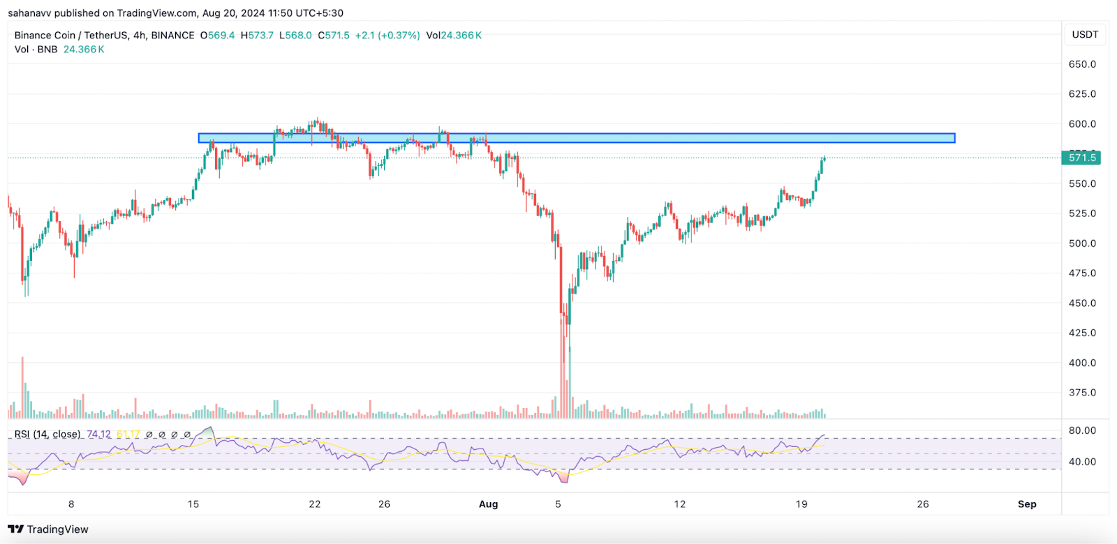 XRP price is showing signs of an extended consolidation as the RSI reached the highs and is preparing for a stagnant trend or a pullback. Hence, the price may trade along with the resistance for a while, followed by a slight rise above $0.62. This may help the token close the monthly trade on a bullish note above $0.65. Besides, the BinanceCoin price has displayed immense strength compared to the other tokens within the top 10. After achieving $600, the token has been facing a bearish pullback, but the rally is expected to reclaim the lost levels soon.