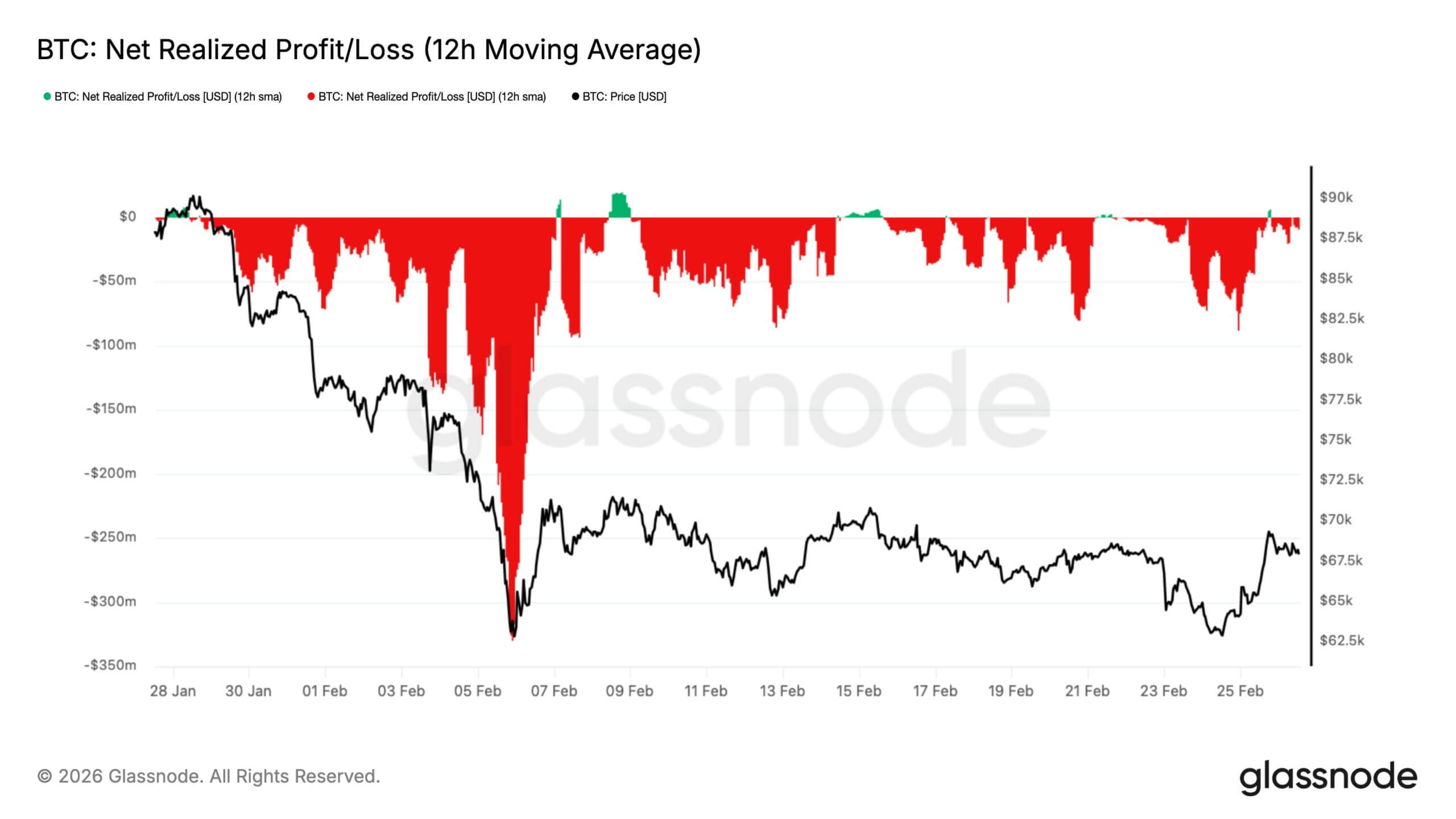Glassnode said smoothed net realized profit and loss rose above $5 million an hour on Feb. 25 as Bitcoin climbed to a peak near $69,400 before stalling.