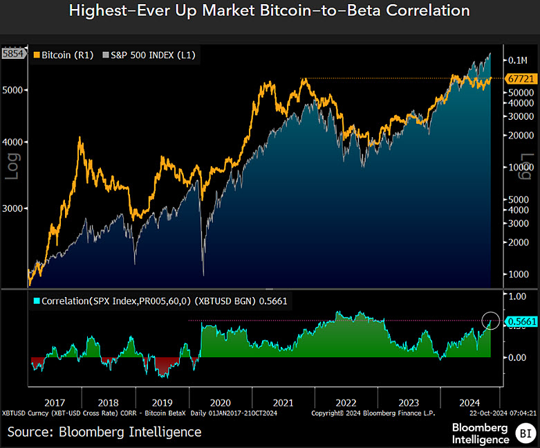 The first chart shows the highest-ever 60-day correlation between Bitcoin and the S&P 500 during a rising market. Notably, the correlation hit 0.5661, indicating that both assets are aligning strongly. This trend had stalled earlier in the year, per a previous report from The Crypto Basic.