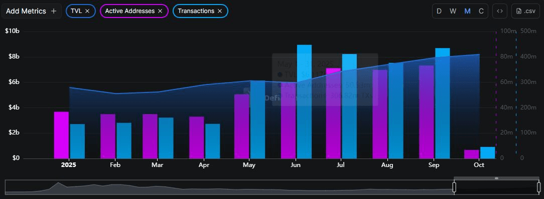 - On‑chain activity is expanding: TLV, active addresses and volume all show notable increases.