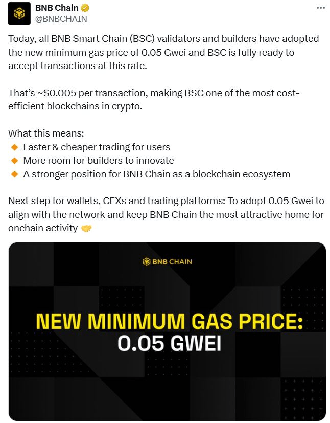 BNB Chain validators adopted a new minimum gas price of 0.05 gwei to lower transaction costs and speed confirmations. The BNB team has signaled further changes to block gas limits and architecture upgrades to support high throughput.