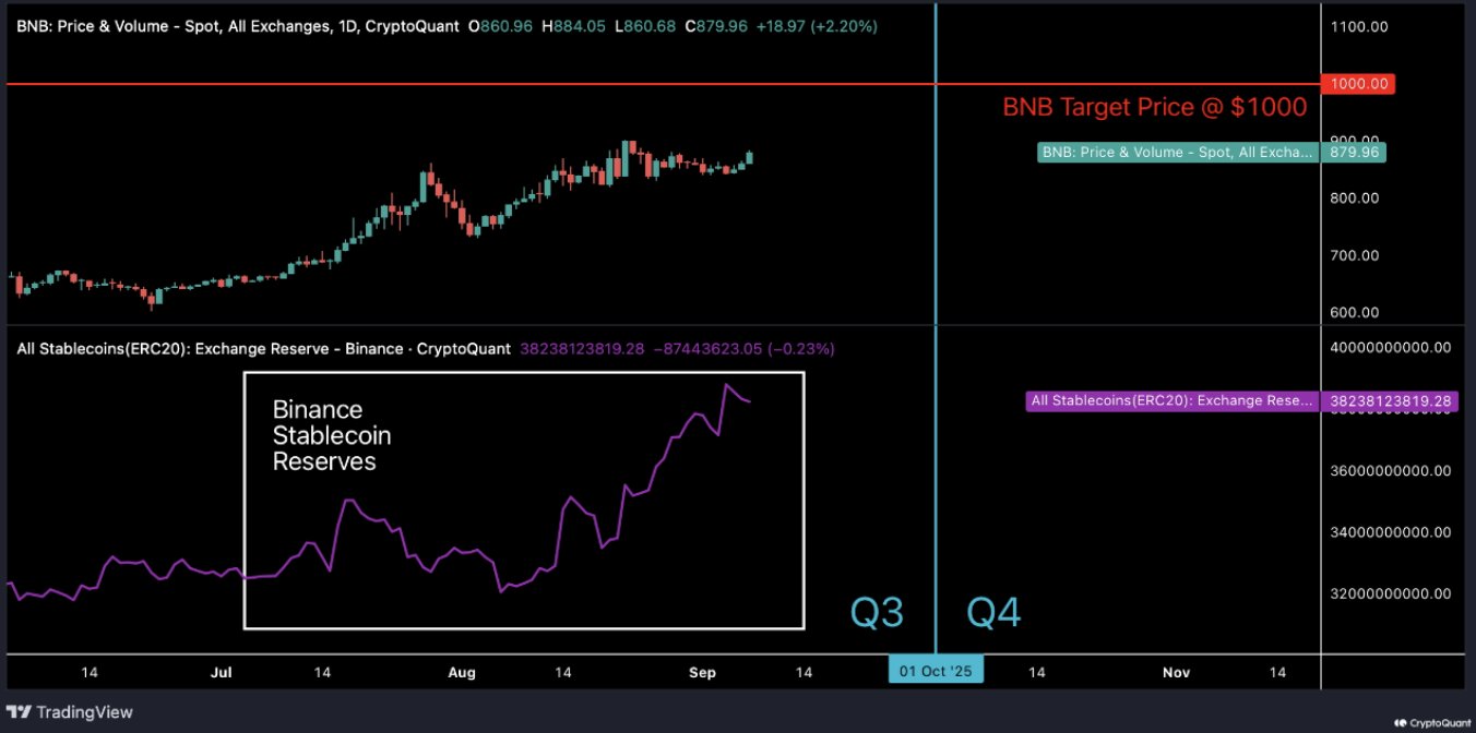 As a result, he predicts that BNB would reach $1,000 in the short term and potentially rally to $1,500 by the end of Q4 2025. This outlook aligns with a recent price prediction from Ash Crypto, who said BNB could hit between $1,500 and $2,000 by the end of the year.