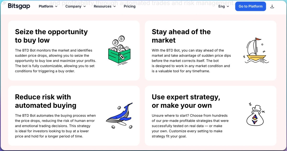Bitsgap’s BTD Bot is specifically engineered to monitor the market for sudden price drops and execute buy orders automatically. But here’s what sets it apart from the competition:
