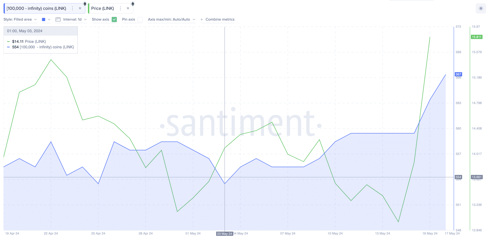The chart above shows that Chainlink had 554 active whale wallets as of May 3 when US Fed announced a rate pause. Since then, whale activity on the Chainlink network has been on a steady rise.