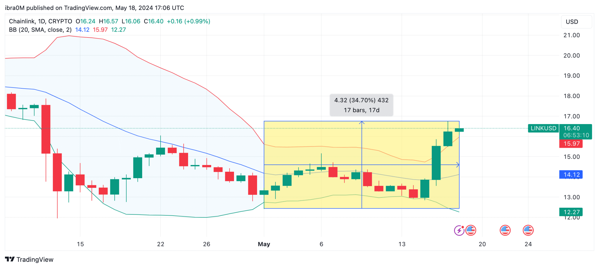 Chainlink price soared to a 40-day peak of $16.7 on May 18, bringing its monthly gains to 34.7%, with on-chain data suggesting increased whale activity amid recent positive US macro indices.