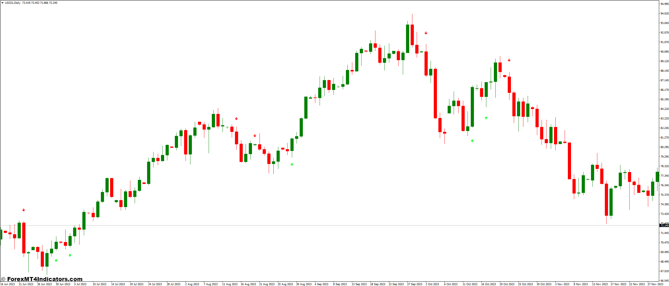 - Alternatively, wait for a downward arrow signal on your charting platform indicating a sell opportunity.