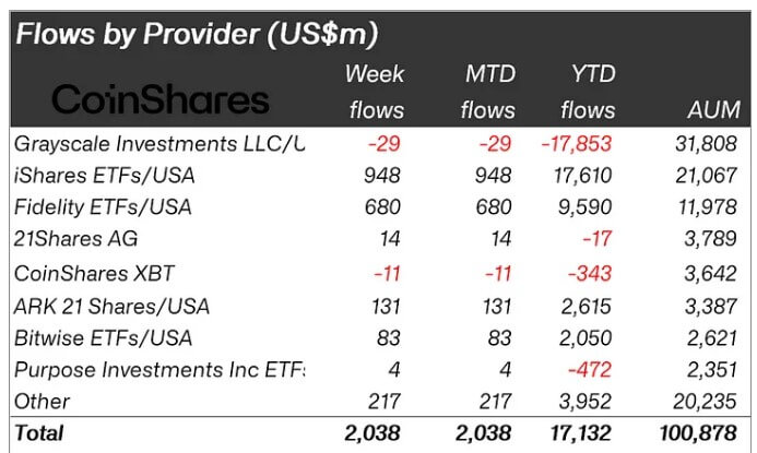 James Butterfill, CoinShares’ head of research, noted that inflows were widespread across providers like BlackRock, Fidelity, Proshares, Bitwise, and Purpose, with a notable reduction in outflows from Grayscale.