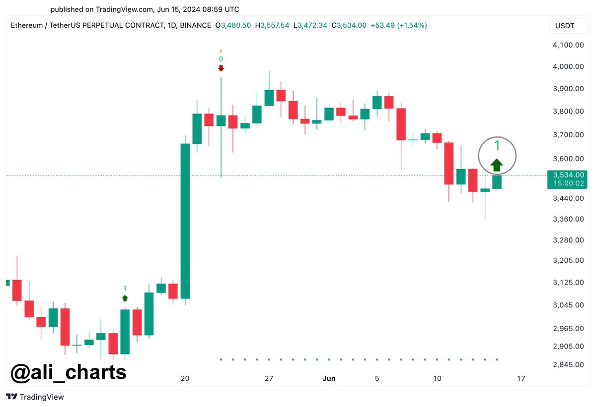 The whale accumulation comes as Martinez says that Ethereum is displaying a bullish signal on its daily chart. The trader says the Tom DeMark (TD) Sequential indicator which is used to determine potential points of reversal for an asset – suggests that a bounce is in sight for Ethereum.