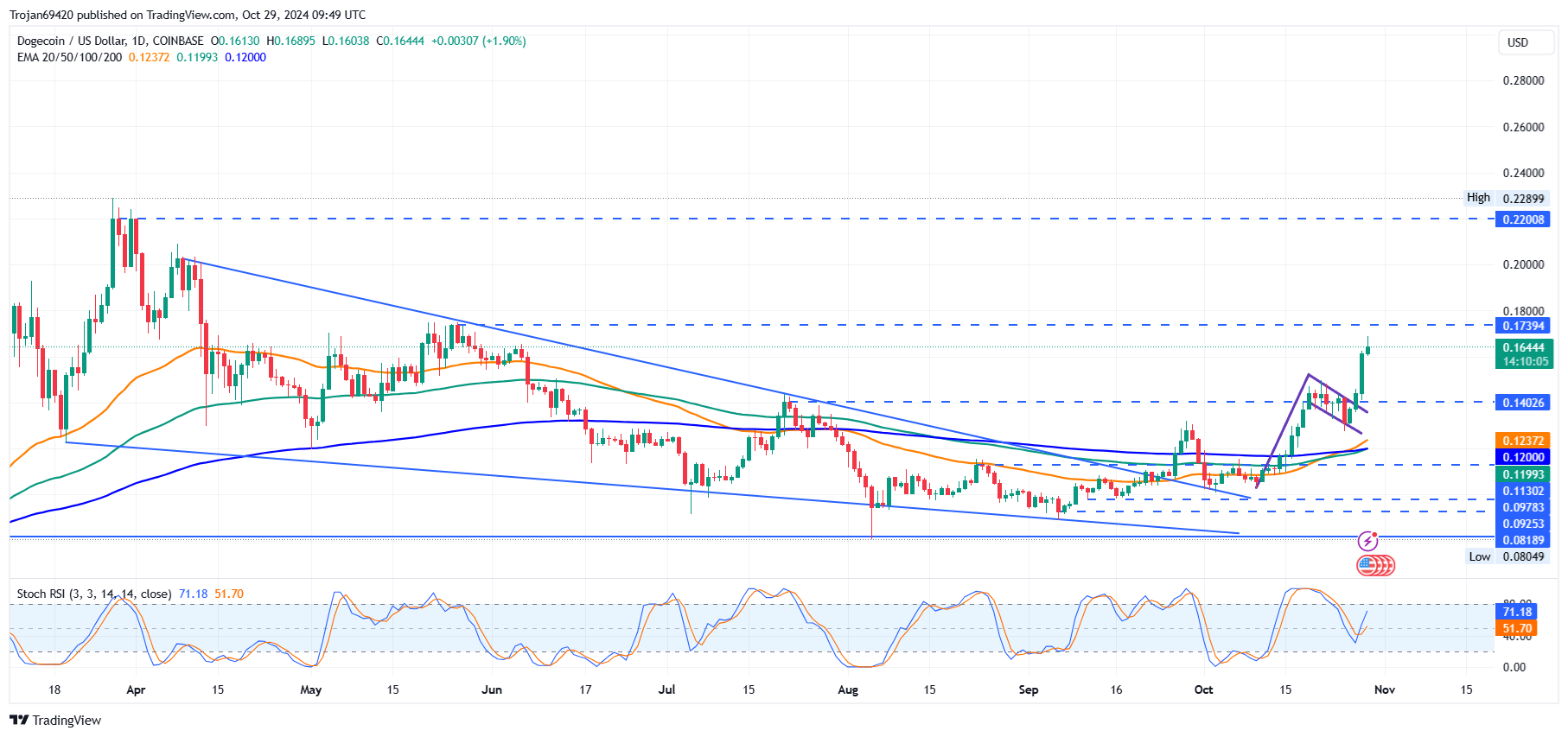 Currently, it is trading at $0.1646 and has achieved a market cap of $24.13 billion. As the eighth biggest crypto asset in the industry, Dogecoin spearheads the meme coin rally and teases a bull run similar to the 2021 era.