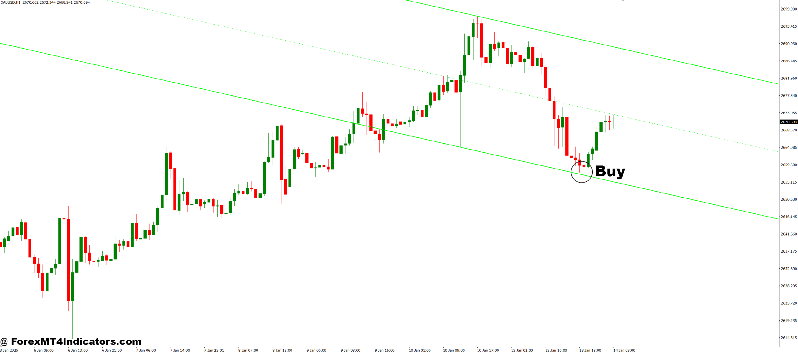 - Wait for the price to touch or approach the lower duct line and show signs of support (e.g., bullish candle or wick rejection).
