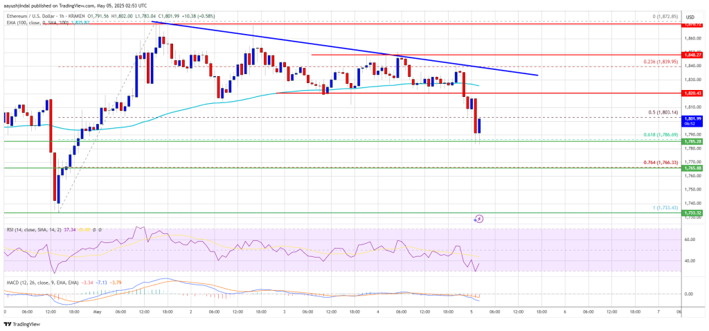 If Ethereum fails to clear the $1,820 resistance, it could start a fresh decline. Initial support on the downside is near the $1,785 level and the 61.8% Fib retracement level of the upward move from the $1,734 swing low to the $1,873 high. The first major support sits near the $1,765 zone.