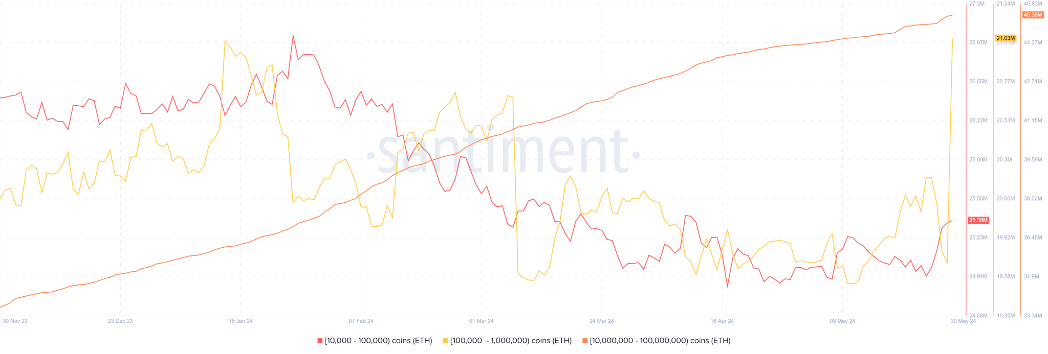 While addresses holding 10,000 to 100,000 ETH and those with 10,000,000 to 100,000,000 tokens have also amassed more tokens within the same timeframe, the increase in their balances is much lower than what was observed with addresses holding between 100,000 and 1 million ETH.