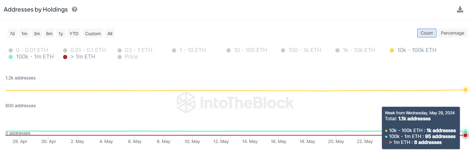 However, in a contrasting trend, those holding between 100,000 and 1 million ETH dropped from 98 on May 25 to the current figure of 95. Meanwhile, the number of wallets with balances greater than 1 million ETH ($3.8 billion) remains fixed at 6.