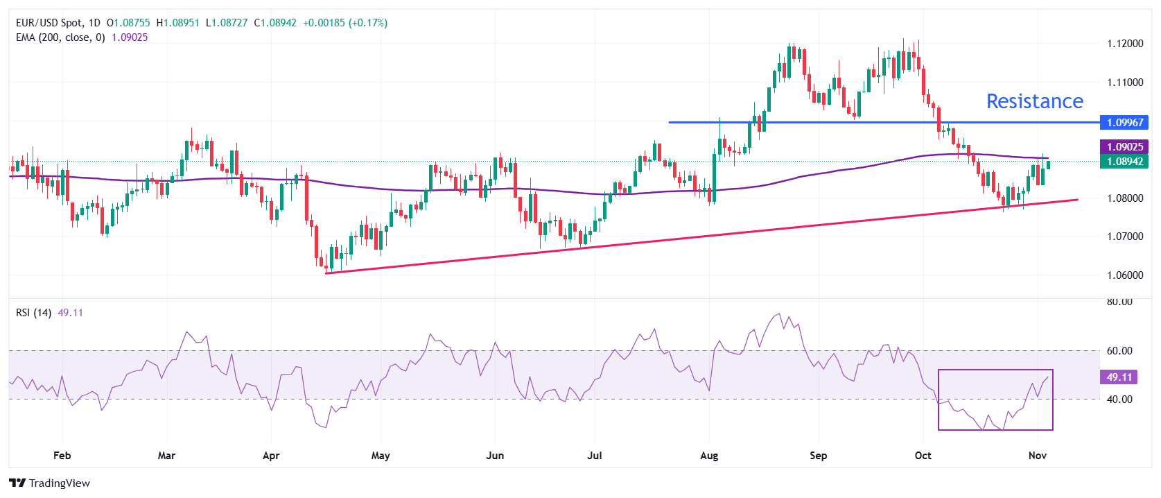EUR/USD struggles for an establishment above the immediate resistance of 1.0900, which also aligns with the 200-day Exponential Moving Average (EMA). The pair rebounded sharply towards the end of October after gaining a firm footing near an upward-sloping trendline around 1.0750, which is plotted from the April 16 low at around 1.0600