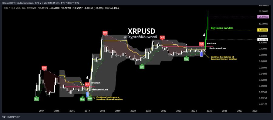 In 2017, XRP experienced a breakout after testing the Donchian Channel resistance multiple times. This led to a massive rally, with “Big Green Candles” indicating bullish momentum at the time. XRP eventually rallied past $3 in early 2018.
