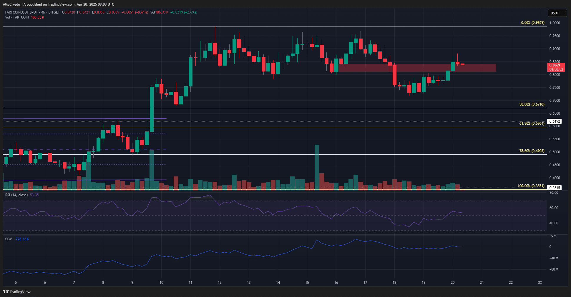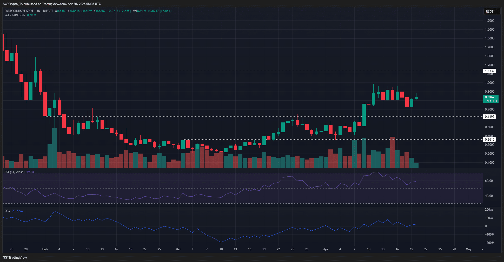 Popular memecoin Fartcoin [FARTCOIN] fell 22% in two days, but has climbed higher from the 18th of April low at $0.717. On the 1-day and 4-hour timeframes, the token has bullish potential.