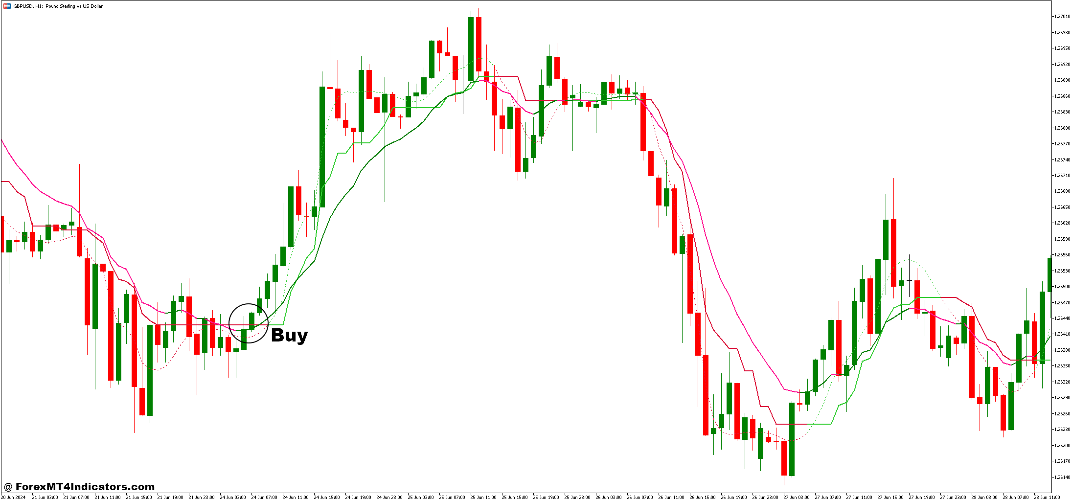 - Enter a buy position as the price begins to move back up after touching or nearing the Fast EMA, signaling a continuation of the uptrend.