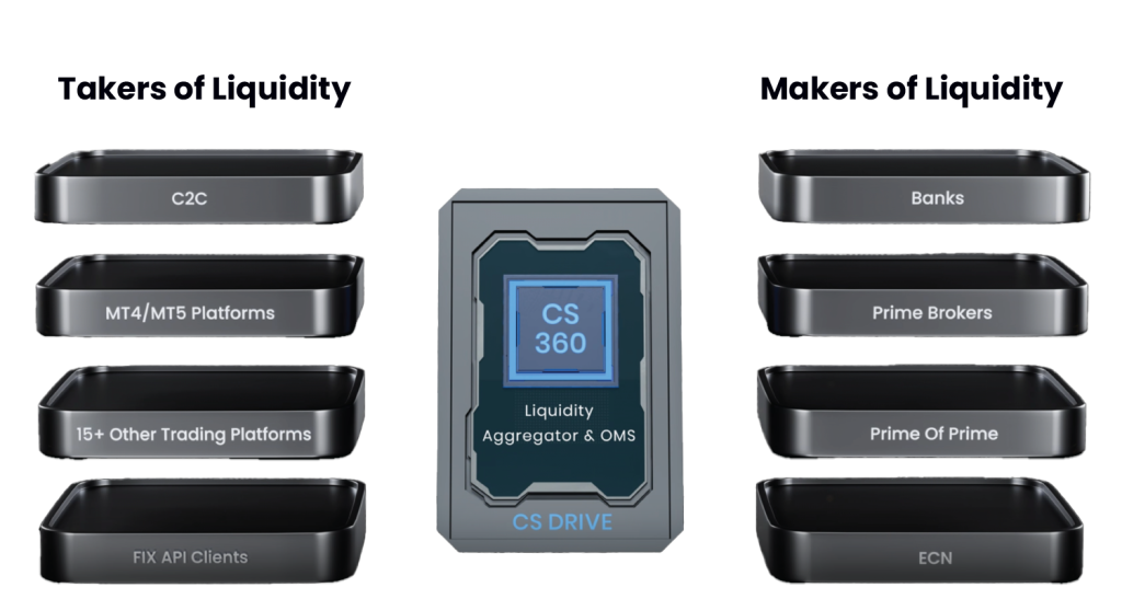Execution and risk are centralized through CS 360, our unified OMS and liquidity engine. This allows institutions to scale fintech activity while preserving revenue capture, compliance, and control – without forcing everyone into the same front end or user experience.