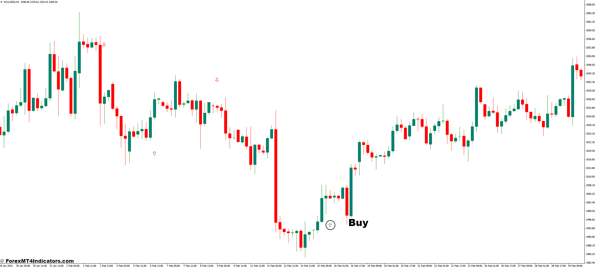 - Signal: Identify bullish divergence on the chart. This occurs when the price makes higher highs (HH), but the FXCX indicator prints lower highs (LH).