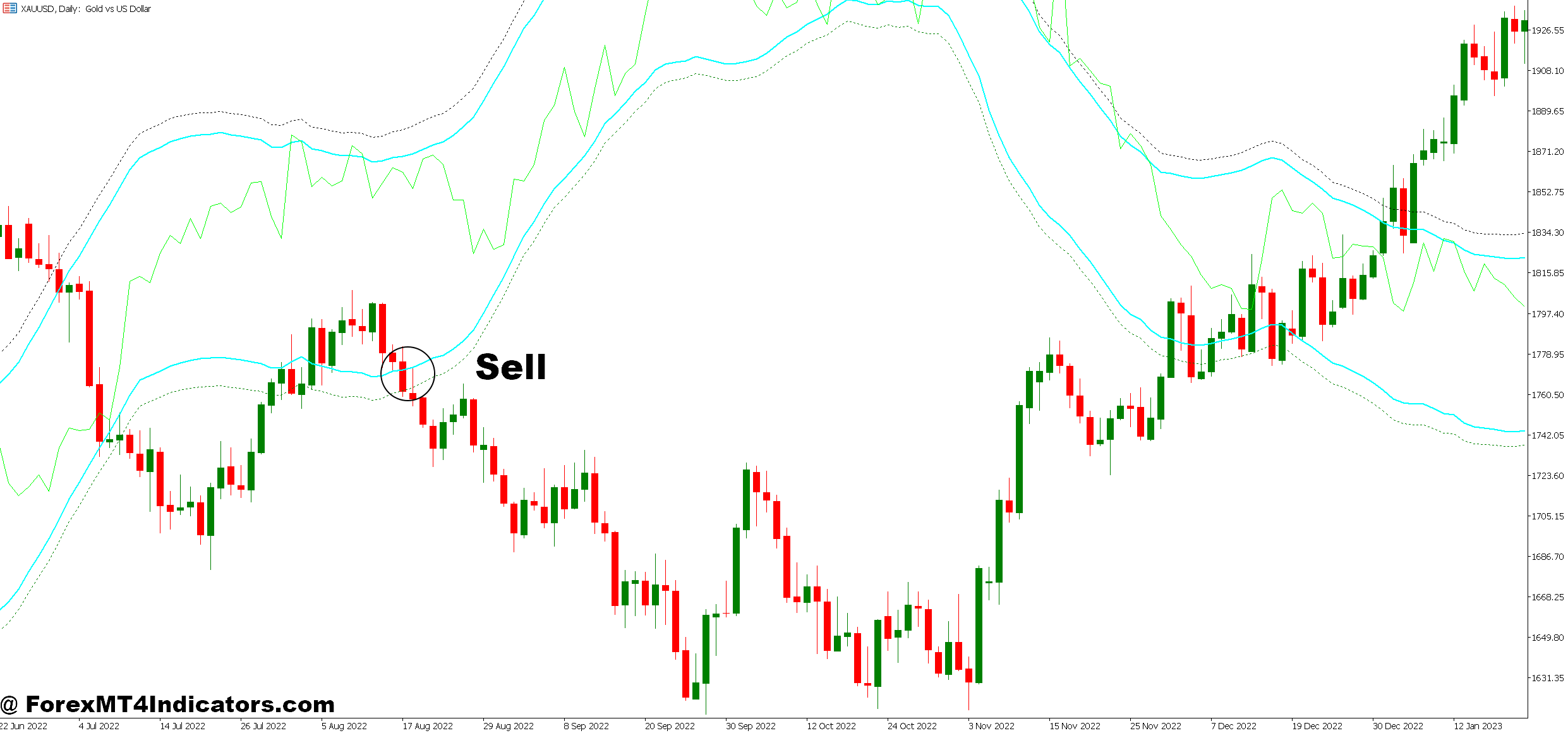 - Line maintains red through rallies – If price temporarily spikes above the Golden Line but closes back below while color stays red, enter short with stop loss 25 pips above the line; common during EUR/USD news reactions.
