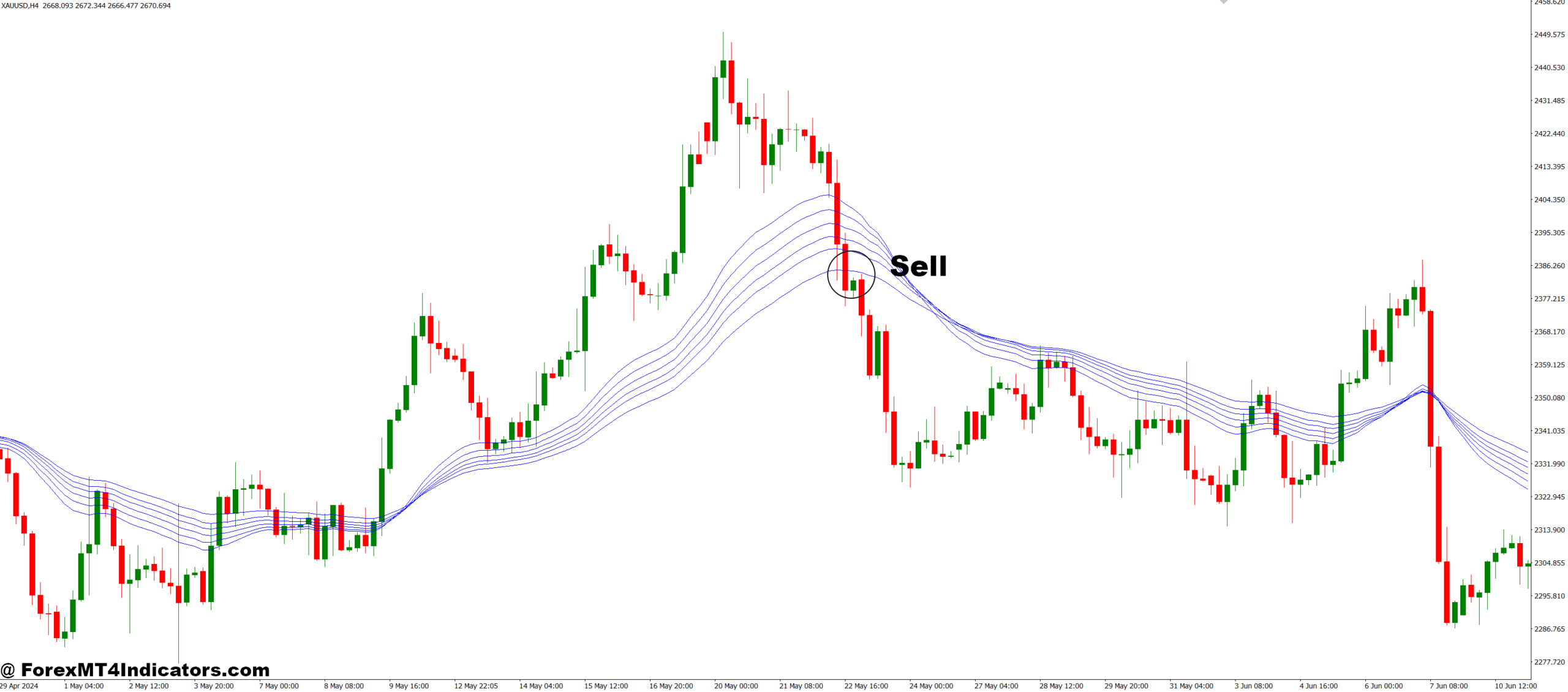 - A retracement that touches or nears the long-term EMAs, followed by a bearish candle, confirms the sell opportunity.