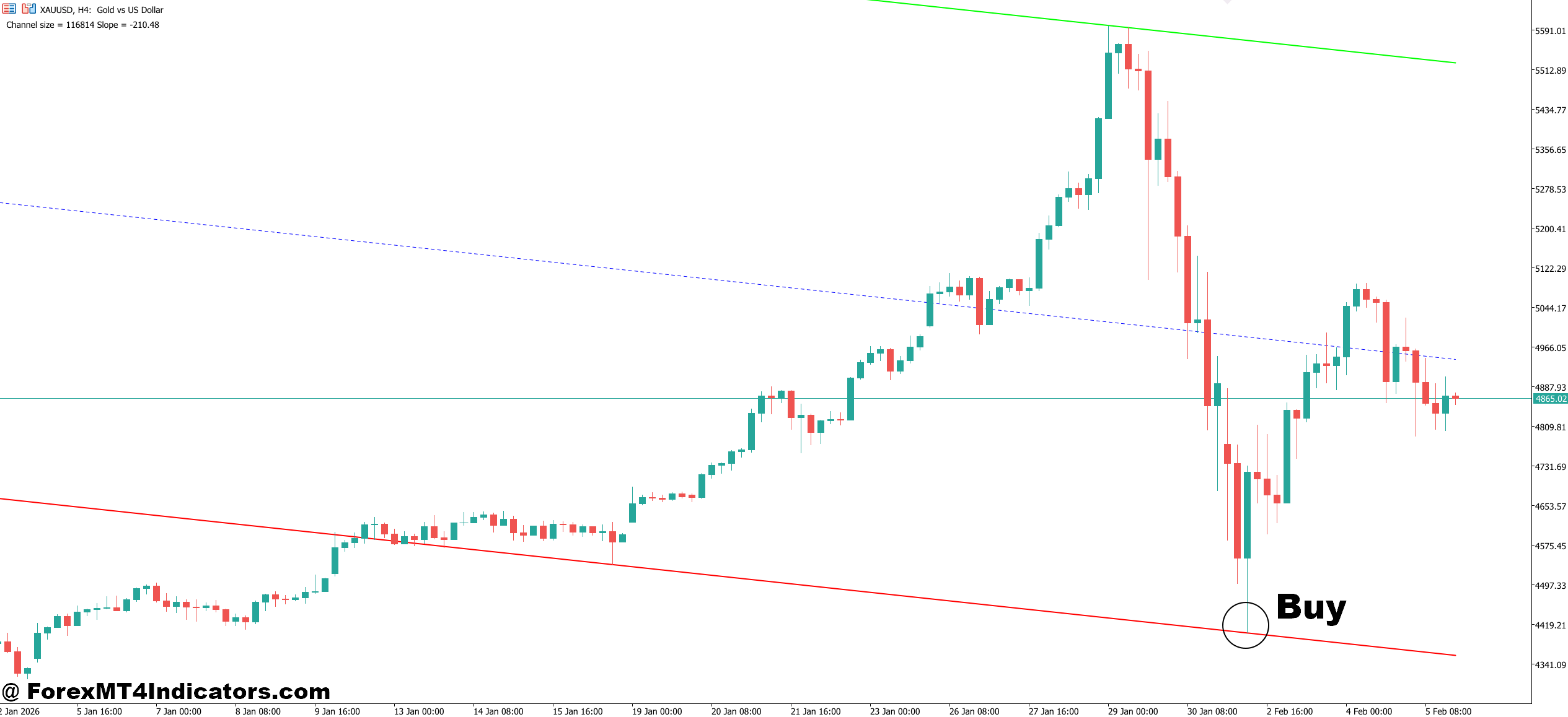 - Confirm the channel slope is rising – Only take buy signals when both channel lines are angled upward. A flat or declining channel means the trend isn’t supporting longs, and you’re fighting the current.