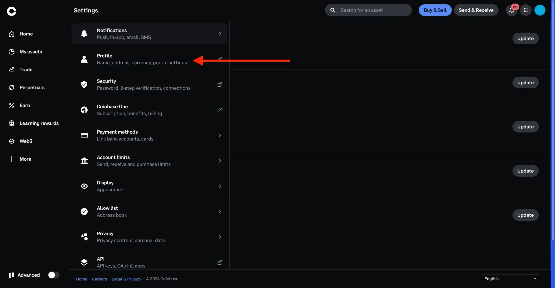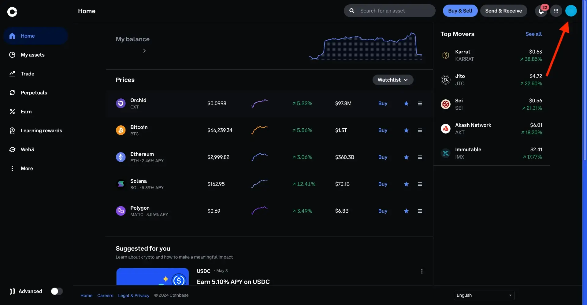After you log in, continue to the Coinbase dashboard page. Go to the upper right corner of the screen and click on the profile icon.