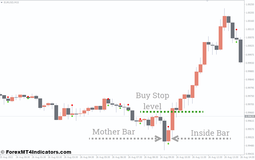 - Identify an Inside Bar: Look for a completed inside bar on your chart. The indicator should visually highlight it (e.g., colored bar or arrow).