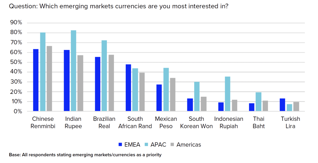 APAC – showed the most interest in the Chinese renminbi, followed by the Indian rupee – reflecting the two countries’ positions as the world’s largest and fastest-growing economies.