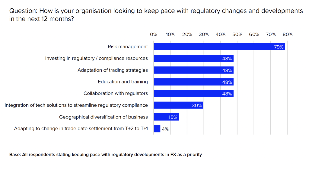 Keeping pace with regulation is a multi-year theme in the FX market and this is unlikely to change. Even as the Trump administration looks to roll back some financial regulations, global trading activity continues to drive a strong focus on compliance. The survey highlights a shared challenge across firms: keeping up with the pace of regulatory change and adapting to developments across multiple jurisdictions. In this area, 79% of respondents cited risk management as a key focus.