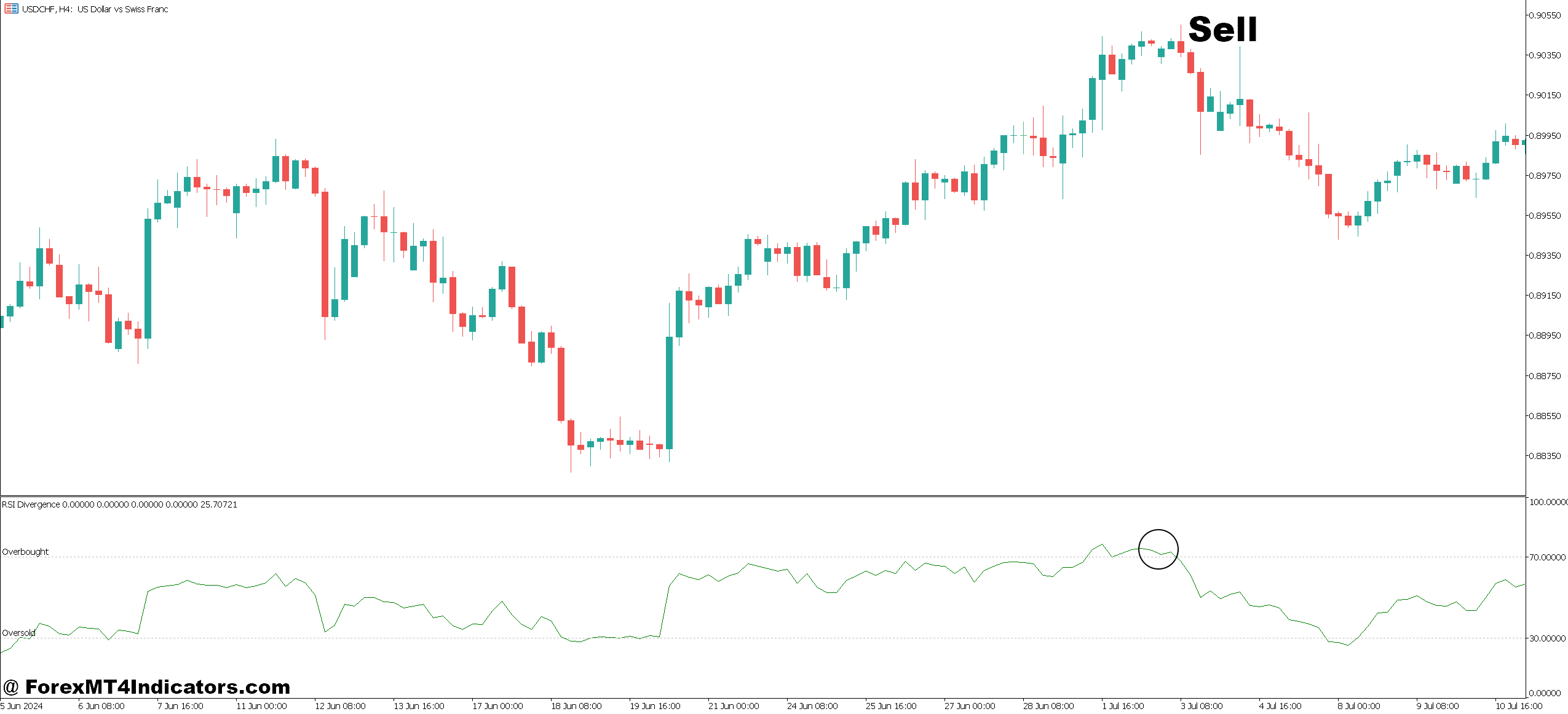 • Verify RSI is above 70 – The most reliable bearish divergence happens when RSI pushes into overbought territory (above 70) while price climbs higher, showing buying exhaustion at extremes.