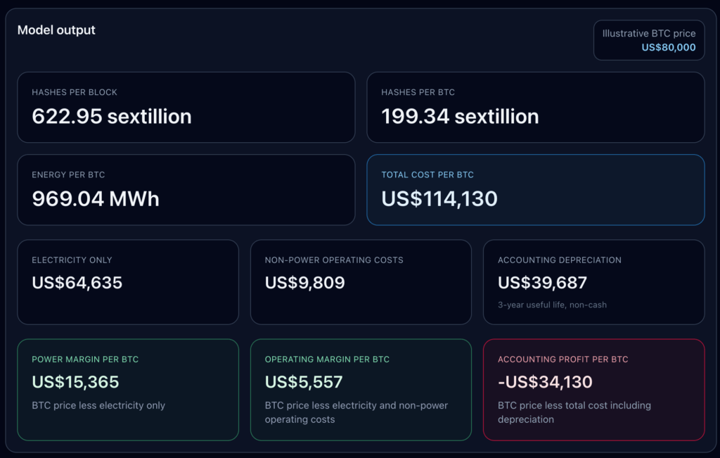That point carries beyond Riot. Riot’s filing-based non-power cost layer and depreciation assumptions are company-specific. Another miner may have a different overhead base, a different useful-life assumption, a different curtailment profile, or a different realized power mix. But we feel the three-layer structure still travels well.