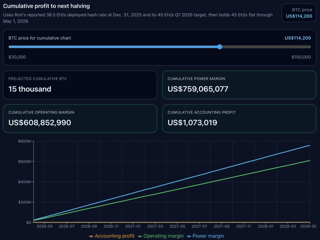 The model then applies company-specific cost inputs using Riot Platforms’ public filings to illustrate how the economics stack up in practice.