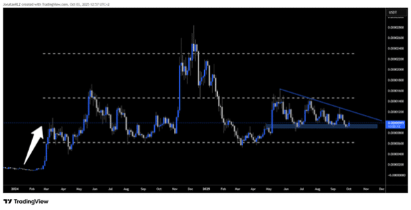 At present, Pepe is testing a support zone while trading below a descending trendline, creating the shape of a descending triangle. A breakout above this trendline could open the way toward the range equilibrium, the middle of the structure. This makes Pepe one of the few meme coins showing signs of potentially breaking away from the typical boom-and-bust pattern.