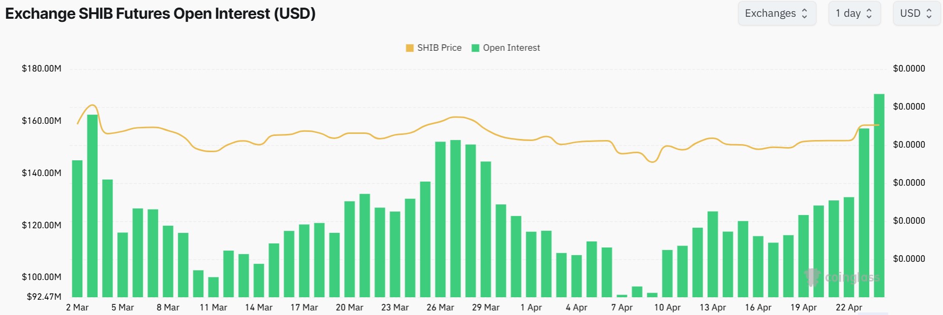 The first metric is open interest, which recently rose to $170M, per data from Coinglass, marking its highest level in over one month. The surging OI indicates that derivative traders are opening new positions on Shiba Inu, as they anticipate that this top meme coin is on the verge of making a major move. Besides, the funding rates are positive, indicating that long traders are more than short sellers, which is also a bullish sign.