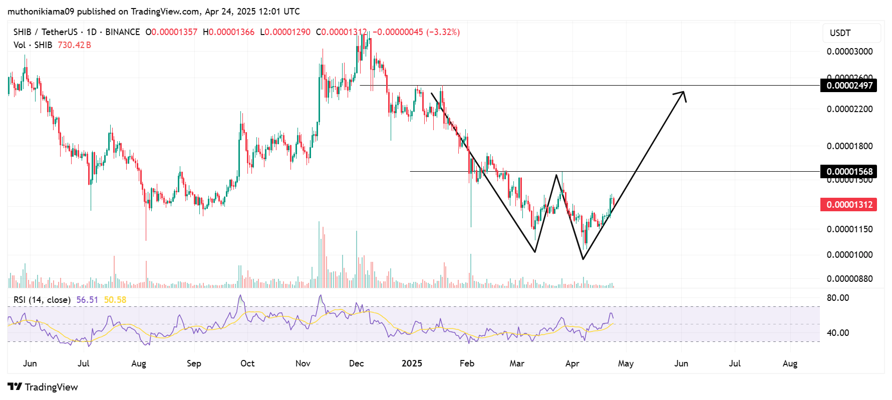 Shiba Inu price might still be poised for more gains as it appears to be forming a massive double bottom pattern on its daily chart. Usually, a double bottom pattern is confirmed when the price breaks the neckline, which in SHIB’s case, lies at $0.000015.