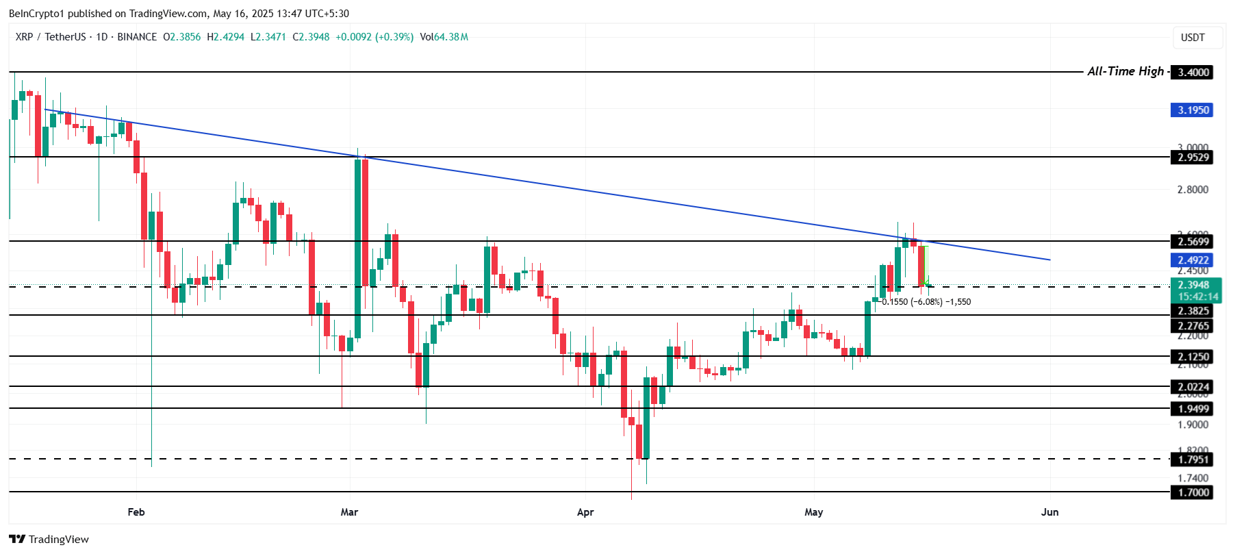 XRP is down 6% in the last 24 hours, trading at $2.39. The altcoin is trapped under a nearly four-month downtrend line, signaling a potential continuation of its decline. This technical resistance poses a significant challenge for any near-term recovery.