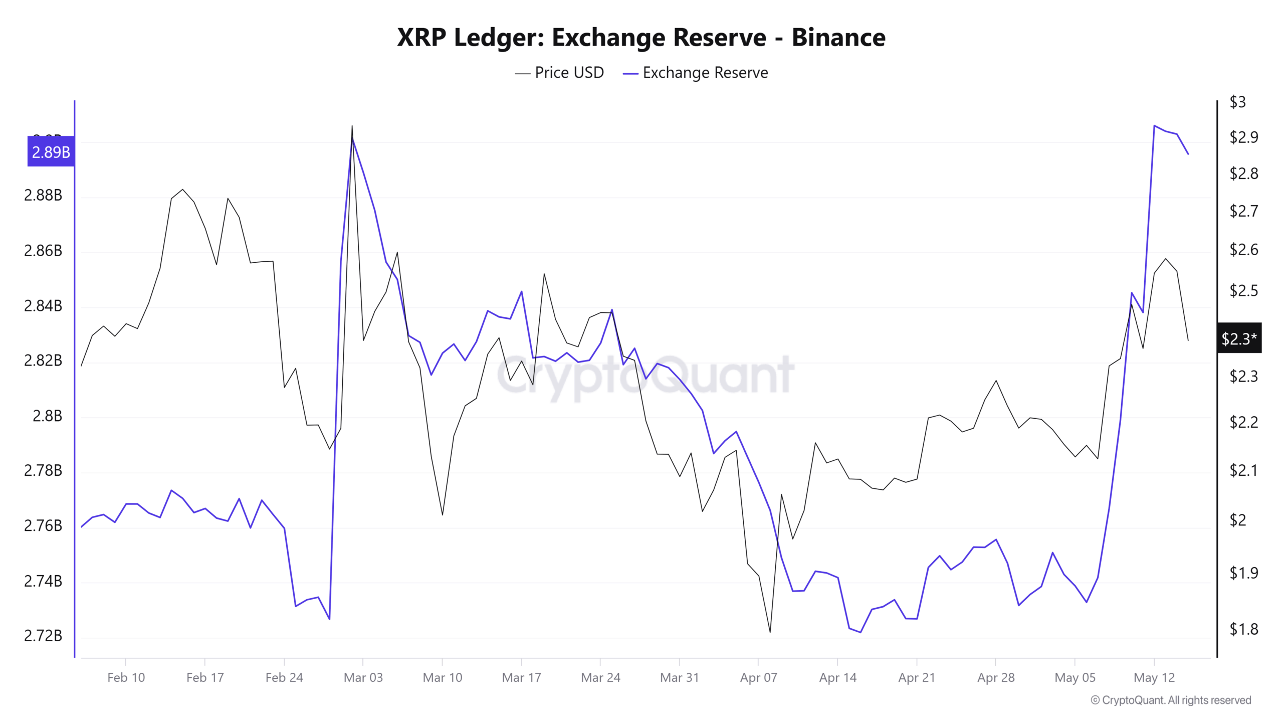 Exchange reserves showed a sharp spike last week, with over 17 billion XRP sent to Binance in just seven days. This amount, valued at more than $40.2 billion, reflects investors’ moves to secure profits or break even after the recent price rally. The surge in selling resembles a similar event in February 2024, which was followed shortly by a decline in XRP’s price.