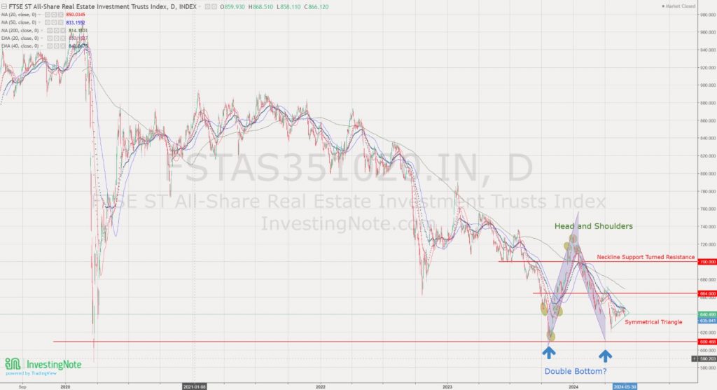 FTSE ST Real Estate Investment Trusts (FTSE ST REIT Index) increased from 632.65 to 640.49 (1.24%) compared to last month’s update. The REIT Index is currently forming a Symmetrical Triangle, consolidation pattern, approaching the apex of the triangle. We shall see which direction the breakout will occur in the next few weeks.